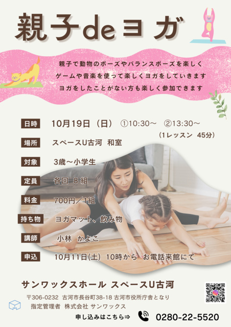 親子で動物のポーズやバランスポーズをゲームや音楽を使って楽しくヨガをする。ヨガをしたことがない人も楽しく体験しよう。3歳~小学生の親子が対象。定員は各回8組(先着順)。申し込みは10月11日(土)10時より電話又は来館にて。講師:小林かよこ