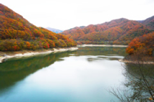 江戸からちょうど五十里のところにあるためこの地名がつけられた「五十里湖」。秋にはダム湖のまわり一面が美しく色づき、鮮やかな紅葉の景色を楽しむことができる。また、トンネルを抜けると八汐湖があり、両湖ともダムサイトからの眺めは絶景。