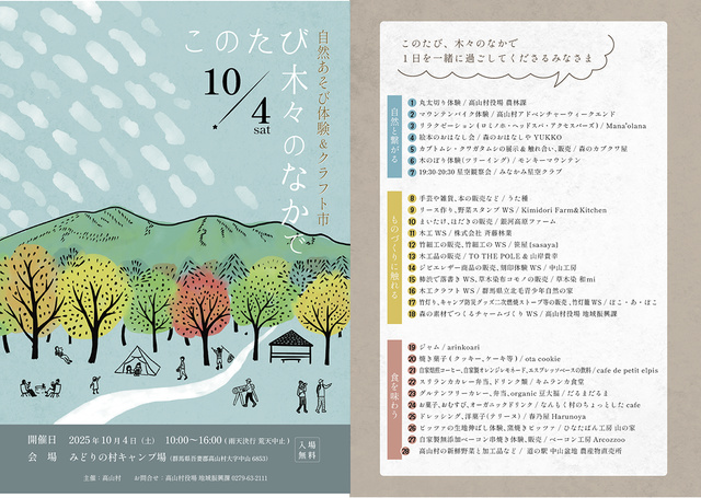 標高700mに位置する「みどりの村キャンプ場」はぐんま天文台が近くにある。星空が舞い、みどり豊かな場所で自然とともに、いきものたちとの体験を通して旅するように時間を過ごしてみては?自然あそび、体験、クラフトおいしい食と木々に囲まれた空間で一日が楽しめる。この旅のなかで新たな発見と出逢いが訪れるように星空観察会も予定している。 ※当日予約制