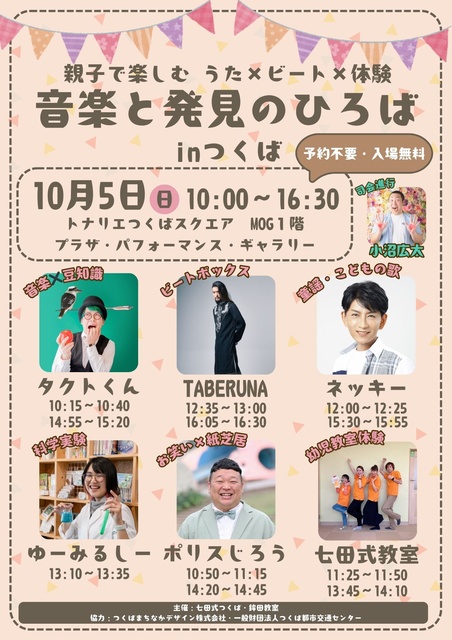 「音楽」「科学実験」「お笑い」などが無料・予約不要で楽しめる、親子向けの特別イベント。歌のお兄さんネッキーや動物ソングのタクトくん、ビートボクサーTABERUNA、科学実験で笑顔を届けるゆーみるしー、子ども向けお笑い芸人ポリスじろうが登場! さらに幼児教育の七田式の先生による体験プログラムも! 小さな子供から大人まで、親子で一緒に笑って学べるステージを届ける。