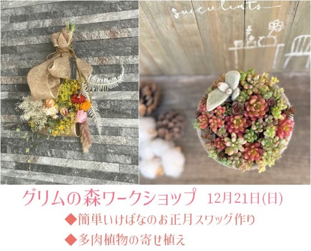 壁や玄関に飾る30cmほどの正月飾りを作る「簡単いけばなのお正月スワッグ作り」、エケベリア、セダムなどを使って寄せ植えを作る「多肉植物の寄せ植え」の2つの講座が行われる。少人数の講座のため、落ち着いてじっくり受講できる。親子、友人同士などでの参加も可能。参加には事前の申し込みが必要。詳細は公式サイトで確認を。