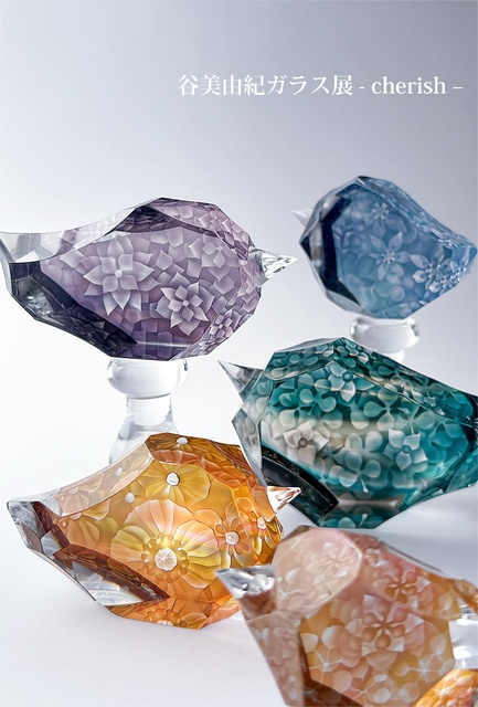 サンドブラスト技法により植物や鳥、動物などを描く谷さん独特な世界を堪能できる。グラス、ボール、オブジェなど50点を展示する。