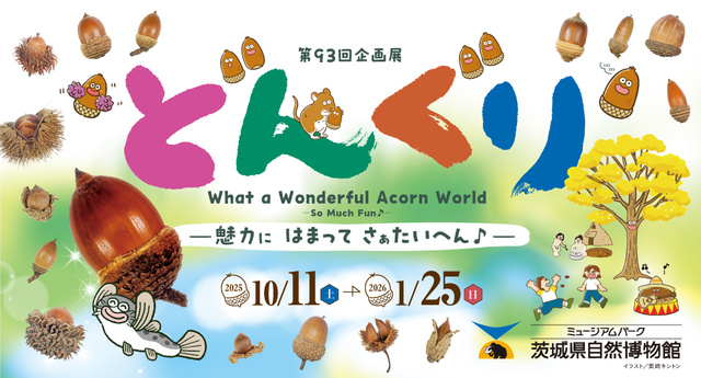 子供のころから拾って遊び、童謡にも歌われる、身近な木の実どんぐり。その姿や形は様々で、発芽して育つと大きな木となり、豊かな生態系を支えている。かつては、人間の食べ物や燃料などの生活の糧となっていた。そんな奥深いどんぐりを、様々な角度から紹介する。どんぐりころころの歌に合わせてつくったオリジナルのストーリーが、各展示コーナーへ導く。