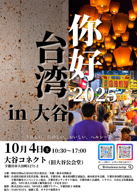 台湾の文化体験を通じて台湾と日本の交流を図るとともに、大谷地区の魅力を、SNSを活用して世界に発信。美味しい台湾料理、台湾の歌、台湾文化体験コーナー、地元大谷のワークショップなど、まるで台湾にいるような気分になれる秋の1日。家族やお友達と一緒に楽しい秋のお出かけにいかが。台湾グルメも見逃せない!