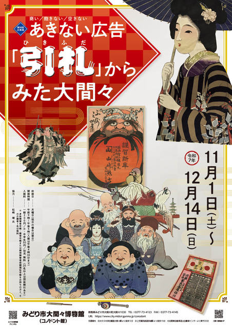 引札とは、江戸時代から昭和初期にかけて配布された広告(チラシ)。錦絵風の絵柄に恵比寿や大黒天などおめでたいモチーフが描かれ、新年の挨拶などにお得意先へ配られた。また、大間々町は、渡良瀬川やその支流にある村々の物資の集散地・在郷町として発展してきた。今展では明治・大正時代の引札を紹介。「飽きの来ない」引札を通して、「商い」で繁盛した大間々の当時の様子を想像しよう。