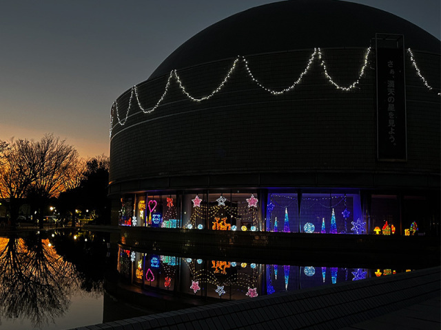 プラネタリウムの外周いっぱいにイルミネーションが輝く。イルミネーションが水に反射する様子はとてもキレイだ。11月29日(土)は16:45~正面玄関広場で点灯式を行う。音色のまちの音楽隊も参加し、点灯式を盛り上げる。