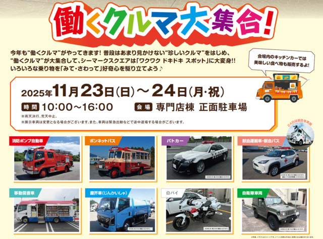 今年も”働くクルマ”がシーマークスクエアにやってくる! いろいろな乗り物を見たり、体験できる2日間! 会場ではトミカの販売会も実施!