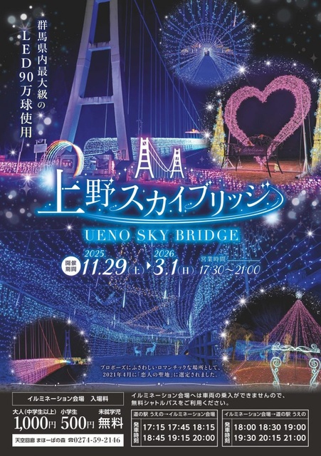 上野村を代表する観光スポット「上野スカイブリッジ」でイルミネーションを開催。地上90メートル、長さ225mの壮大なスケールの橋上からの大パノラマに包まれながら、まるで空中散歩をしているかのような浮遊感が楽しめる。巨大な吊り橋と周辺にLED約90万球を使用したイルミネーションは県内最大規模!ここでしか見られない、空に輝く星と幻想的な景色を楽しもう。