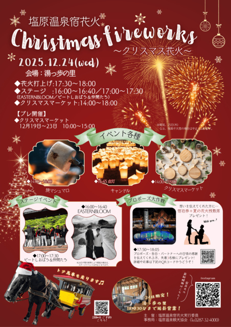 今年初めて、塩原温泉街でクリスマスマーケットとクリスマス花火を開催する。ステージイベントや焼マシュマロなど、楽しめるイベントもあり。クリスマスイブにちなんで、「プロポーズ大作戦」を実施する。想いを伝えてくれた人には豪華なプレゼントがもらえる。クリスマスマーケットは12/19~24まで開催する。