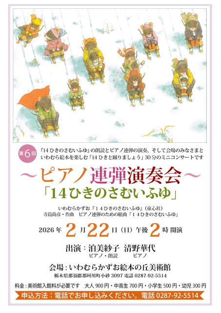 さむいふゆの季節にぴったりな、絵本の朗読とピアノ連弾のミニコンサートだ。いわむらかずおの絵本『14ひきのさむいふゆ』(童心社)と、絵本の世界をイメージしたピアノ連弾のための組曲「14ひきのさむいふゆ」(寺島尚彦作曲)を、ピアニスト泊美紗子と清野華代が演奏・朗読する。ちいさな子どもから大人まで楽しめる。ほかに、参加者といわむら絵本を楽しむ《「14ひき」と踊りましょう》も。要予約。美術館入館料が必要。