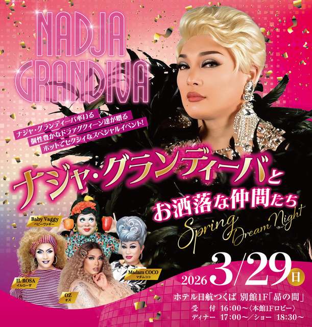 テレビやラジオで多彩な才能を発揮するドラァグクイーン“ナジャ・グランディーバ”が、個性豊かなクイーンたちとともに贈る華麗な一夜。ホテル日航つくば総料理長がこの日のためだけに手がけたスペシャルディナーと共に、一夜限りの “Spring Dream Night”を、心ゆくまで堪能しよう。