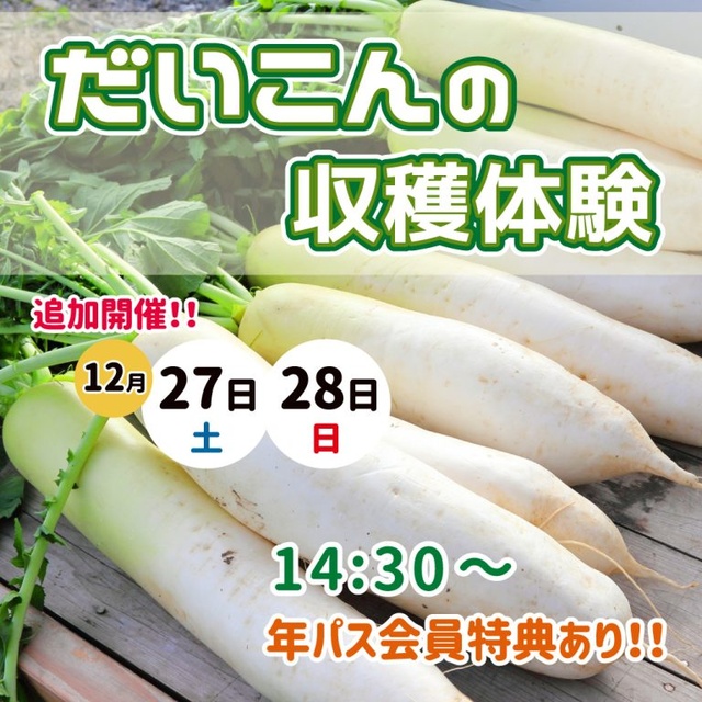園内の収穫畑で育った大根を自分の手で収穫してみよう! 収穫した大根はそのまま持ち帰れる。おでんやお鍋、大根おろしなど冬の食卓に大活躍。受付は入園ゲート入ってすぐ左側の畑。定員先着100名。こもれびFUNCLUB会員のは提示で特典あり。