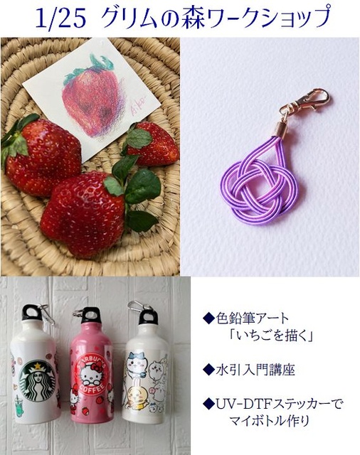 キャラクターなどのステッカーを貼って作る「UV-DTFステッカーでマイボトル作り」、いちごを描く「色鉛筆アート」、基本的な結び方を学びキーホルダーを作る「水引入門講座」の3つの講座が行われる。少人数の講座のため、落ち着いてじっくり受講できる。親子、友人同士などでの参加も可能。参加には事前の申し込みが必要。詳細は公式サイトで確認を。
