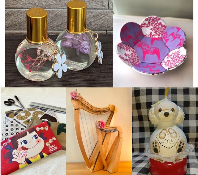 | 料金 | 有料 ロールオンアロマづくり1,200円、ミニハープ体験500円、ミニハープコンサート500円、アップサイクル講座2,300円、ひょうたんランプ3,300円、カルトナージュ2,600円 |