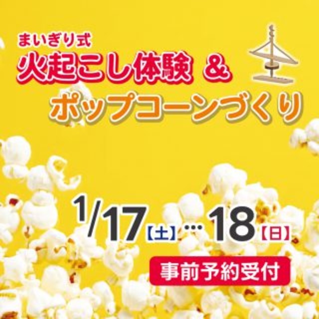 昔の人はどのように火を起こしていたのだろう?「まいぎり式」という火起こしの道具を使って、薪へ自分で火を付けてみよう!自分で付けた火を使って、ポップコーンを作ってみよう。