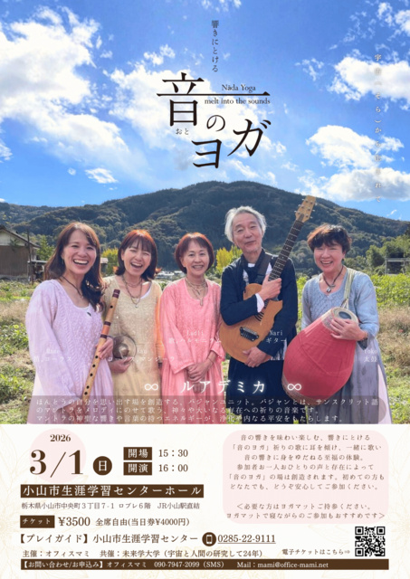 ほんとうの自分を思い出す場を創造する、バジャンユニット。∞ ルアデミカ ∞ 祈りの歌に耳を傾け、一緒に歌い音の響きに身をゆだねる至福の体験。参加者一人ひとりの声と存在によって「音のヨガ」の場は創造される。初めての人もだれでも気軽に参加しよう。必要な人はヨガマット持参。ヨガマットで寝ながらの参加もお勧め。