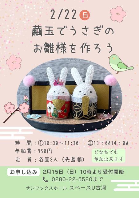 繭玉や千代紙を使ってかわいいうさぎのお雛様を作ろう。定員は各回8名。だれでも参加OK!