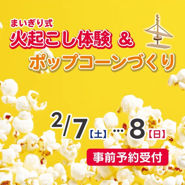 昔の人はどのように火を起こしていたのだろう?「まいぎり式」という火起こしの道具を使って、薪へ自分で火を付けてみよう!自分で付けた火を使って、ポップコーンを作ってみよう。