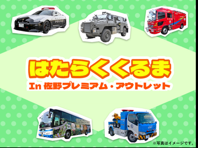 栃木県の地域の生活や安全を守り、様々な場面で活躍する車を集めたイベント、「はたらくくるまin佐野プレミアム・アウトレット」を開催。消防車両、警察車両、自衛隊車両の他、大型バスやレッカー車など「はたらくくるま」を間近に見て写真撮影をしたり、隊員にお話を聞いたりと、本とは違う「体験」を楽しむことができる。また子ども向けに制服を試着しての記念撮影もあり。