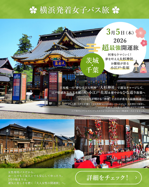 3月5日は凍てつく冬が終わり、生き物が目覚める「啓蟄」の日。新しい始まりにふさわしい最強開運日に、パワーに触れる旅へ!! リピート率80%以上、約6割以上が30~60代の1人参加、「旅する女子会」なバスツアー。今年一年の運気を上げる超最強開運旅へ!