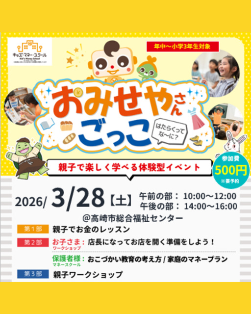 子どもたちにわかりやすく、「お金の大切さ」や「親への感謝」を伝える。ママ・パパ向けにも、「おこづかいのルール」についてのお話も! このスクールを通して「お金」というものに興味を持ってもらい、少しでも金融教育のお手伝いをしたいとの思いから開催される。子どもたちへ、お金の大切さやありがたさを伝えてみては? お金に対する考え方を「おみせやさんごっこ」を通じてたのしく勉強しよう。