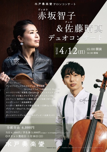 なかなか聴く機会がないヴィオラとチェロのデュオ。ミュンヘン国際音楽コンクール第3位のヴィオラ奏者、赤坂智子。同じく同コンクール優勝のチェロ奏者、佐藤晴真。国内外で大活躍する両氏のデュオによるコンサート。どちらも人の声に近いと言われる弦楽器。低音の重なりを愉しもう。