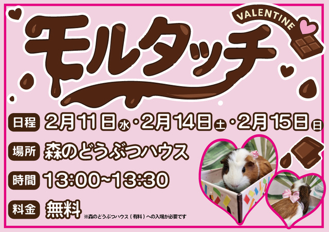バレンタイン風に飾られたモルモットたちが、膝の上の小さな専用ボックスにちょこんと集合。間近で観察したり、触れ合えたりするよ。参加しよう!