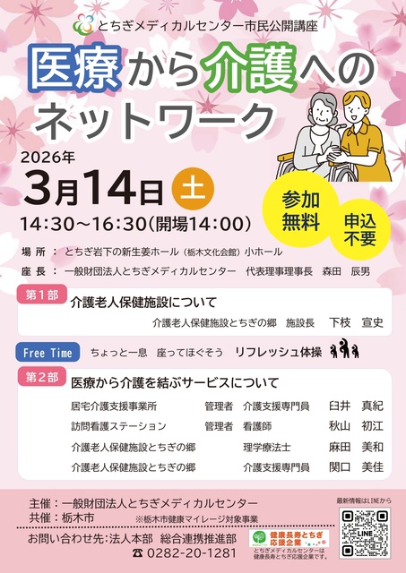 市民公開講座「医療から介護へのネットワーク」を開催する。介護老人保健施設とちぎの郷の医師、理学療法士、介護支援専門員と居宅介護支援事業所の介護支援専門員、訪問看護ステーションの看護師が講演する。参加申込不要。この講座は栃木市健康マイレージ対象事業。