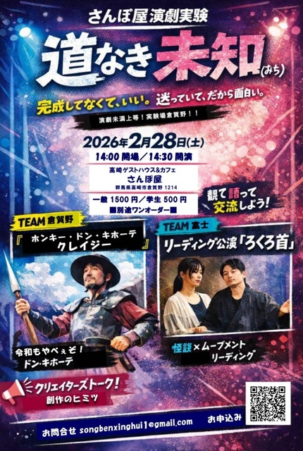 ゲストハウス&カフェさんぽ屋での演劇シリーズ。群馬と他エリアの演劇人によるジョイント公演。ゲストハウスという場所ならではの交流と、創造を促進させる1日。世界中で愛されるドン・キホーテから着想を得た一人芝居、『ホンキー・ドン・キホーテ・クレイジー』。小泉八雲の怪談小説読み上げに、俳優のムーヴメントを組み合わせたリーディング公演『ろくろ首』の2本立て。終演後には、俳優たちのアフタートーク付。