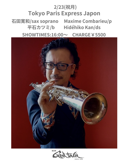 Tokyo Paris Express日本在住の石田寛和がフランスで出会ったHidehiko Kanと立ち上げた、日仏ミュージシャンを相互に行き来させ新しい潮流を創り出すプロジェクト。石田寛和 Hidehiko Kan双頭ユニットTokyo Paris Express Japon。石田寛和/サックス、Hidehiko Kan/ドラムス、Maxime Combarieu/ピアノ、平石カツミ/ベース。