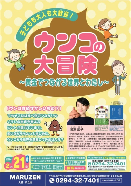 「ウンコは恥ずかしいもの?」でもそこには食べ物のつながりやくらしの未来を考えるヒントが隠れている。法政大学の湯澤規子先生と、笑いながらちょっとまじめに、世界を見直してみよう。ワークショップ終了後、湯澤先生のサイン会実施。対象は丸善日立店で購入した本に限る。定員は各回20組40名(先着順)。問合せ電話番号より申込。
