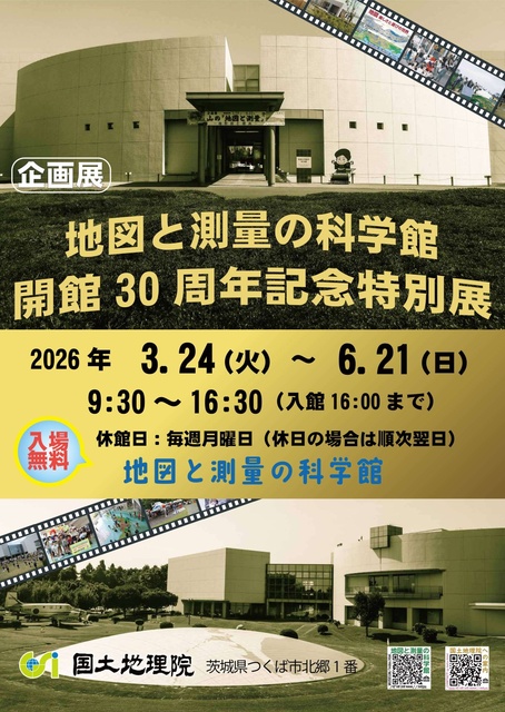 「地図と測量の科学館」開館30周年記念特別展として、過去の企画展の振り返りと「地図と測量の科学館」開館から30年の歩みなどを紹介する。過去の企画展のポスターや過去の企画展で紹介した技術の最新情報、「地図と測量の科学館」開館から30年の歩み等を展示。