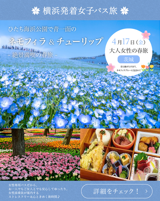 大人女性の春旅、茨城・ひたち海浜公園で、丘一面に広がる青いネモフィラとカラフルなチューリップ。ランチは地元で愛される老舗料亭の旬彩和食御膳。茨城名物「干し芋」スイーツ付き! リピート率80%以上、約6割以上が30~60代の1人参加、「旅する女子会」なバスツアー。五感が満たされる、とっておきの一日を一緒に過ごしてみてはいかが?