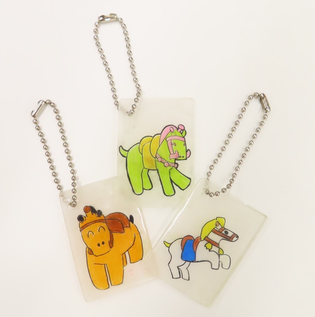 はにわワークショップを開催。3種類の馬形はにわの絵からひとつを選び、プラ板にトレースして、好きな色で塗る。塗り終えたら、オーブントースターでプラ板を加熱して縮める。最後にボールチェーンをプラ板の穴に通せばキーホルダーが完成。ワークショップの参加は当日館内で受付。1日6回開催(所要時間約30分)で、定員は各回20名。