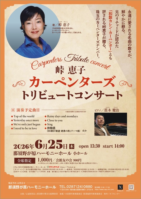 兄リチャードが認めた「和製カレン」こと峠恵子が届けるカーペンターズの名曲の数々。出演は歌:峠恵子、ピアノ:笛木健治。※車いす席希望者は購入前に会館に問合せ
