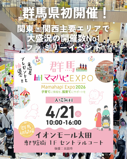 群馬県で初開催の子育て応援イベント。「子育てに情報を、弧育てにサポートを」ママハピEXPOは子育てをしているファミリーを対象とする情報イベント。赤ちゃんと一緒に楽しめる撮影ブースやワークショップなど『Littleマルシェ』も同時開催。当日スタンプラリー参加でおもちゃ、絵本など豪華賞品が当たる抽選会参加や、うれしい来場プレゼントも用意。子ども連れ安心のイベント。入場には参加申込が必要。