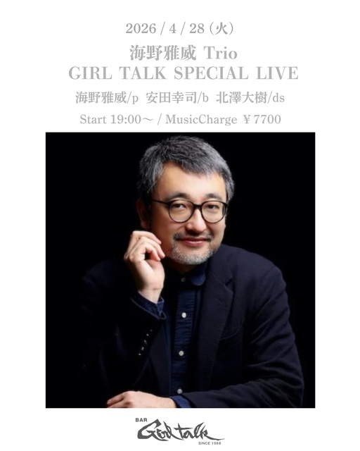 日本人史上初、ジミー・コブやロイ・ハーグローヴのレギュラーメンバーとして世界で活躍。2020年NYでアジア人ヘイトクライムの犠牲となり、ピアニスト生命に関わる重症により復帰は絶望視されたが、不屈の精神と懸命なリハビリにより奇跡的に復帰。本場アメリカの巨匠たちから深く信頼され、現在はジェフ・ハミルトンのピアニストとしても活動するまさにワールドクラスの存在。海野雅威/p、安田幸司/b、北澤大樹/ds。