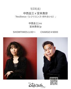 ZOOに提供した「Choo Choo TRAIN」が大ヒットし、JAM広告音楽大競技会作曲賞を受賞。同じ年には「Woman」も大ヒットし、日本レコード大賞作曲賞を受賞。この年にはNHK紅白歌合戦にも出場の中西圭三。ジャズピアニストであり、また多方面なワークをこなすスーパーウーマン宮本貴奈と長年培ってきたコラボレーション。中西圭三/vo、宮本貴奈/p、Resilience(折れない心)。