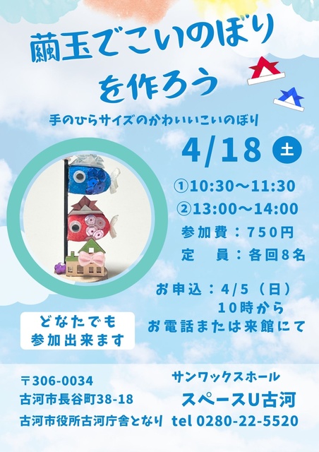 まゆ玉を使って手のひらサイズのかわいいこいのぼりを作る。お部屋のワンポイントやプレゼントにぴったり。季節のクラフト制作を楽しもう。小学2年生以下は保護者同伴。受付開始:4/5(日)10:00~。