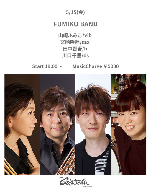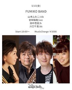 ヴィブラフォン奏者、山崎ふみこサウンドを実現すべく今回もゴージャスなメンバーが揃う。新譜『STYX』をリリースしたばかりのFUMIKO BANDが、水戸で熱く鳴り響く! 秋のさんま祭りからさらに進化したステージ、今年の締めくくりに、心を踊らせにいこう。山崎ふみこ/vib、宮崎隆睦/sax、田中晋吾/b、川口千里/ds。