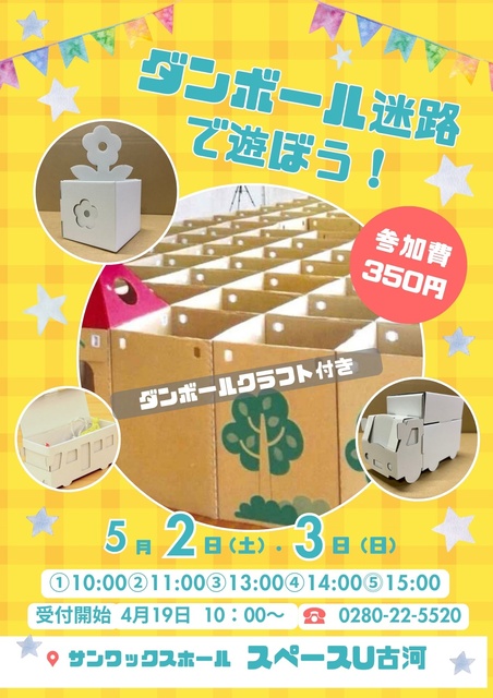 GWは「ダンボール迷路で遊ぼう!」。スペースU古河にダンボール迷路がやってくる! 対象は小学生以下。ちびっこ集まれ! 迷路で遊んだあとは、ダンボールで楽しい工作も(ダンボールクラフト1個付き)。家族、グループでの申込可。申込は4月19日(日)10時より電話受付(先着順)。小学2年生以下は保護者同伴。