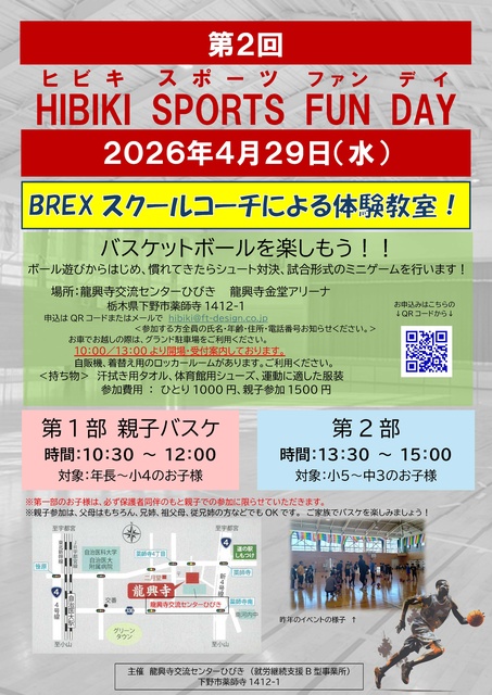 | 開催期間 | 4月29日(水) 第1部(年長~小4)10:30~12:00、第2部(小5~中3)13:30~15:00。 |