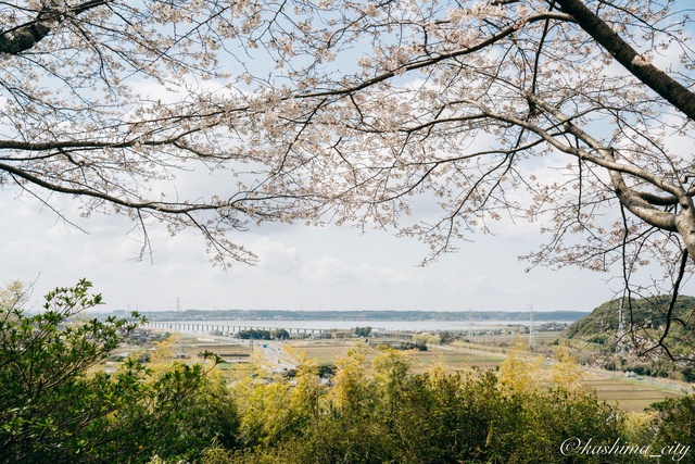 茨城県東南部で最も素晴らしい桜の名所の一つが鹿嶋市の鹿島城山公園。北浦を臨む小高い丘に整備された公園には、筑波山までが望める展望だけではなく、300本を超えるソメイヨシノをはじめ、シダレザクラやヤエザクラなど様々な桜が植えられている。また、桜のほかにもレンギョウやムスカリ、たんぽぽなど、春の訪れを感じることができる花が咲き始めている。