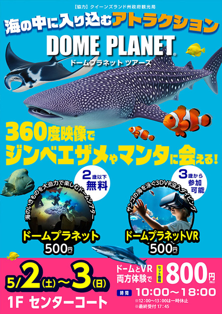 イーアスつくばにて、「ドームプラネットツアーズ」を開催する。ドームプラネットツアーズは、視界いっぱいに広がるドーム映像とVRで、まさにその場にいるような感覚を楽しめる体験型アトラクションである。今回はジンベエザメやマンタ、グレートバリアリーフのサンゴの海など、海の世界をめぐる。