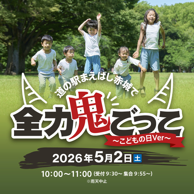 道の駅まえばし赤城で全力鬼ごっこに参加しよう!子どもの日に向け、こどもが主役の鬼ごっこ!みんなは鬼から逃げ切れるか!?鬼ごっこは3種類!オリジナル企画となっているため、気軽に参加しよう!【第1回戦】 とにかく全力疾走鬼ごっこ【第2回戦】 まえばしバナナ鬼【第3回戦】 ⼿つなぎ⻤ごっこ最後は大人vsこども全員の鬼ごっこも!?そして、走りきったあとはみんなで記念撮影!